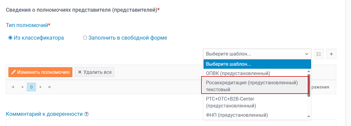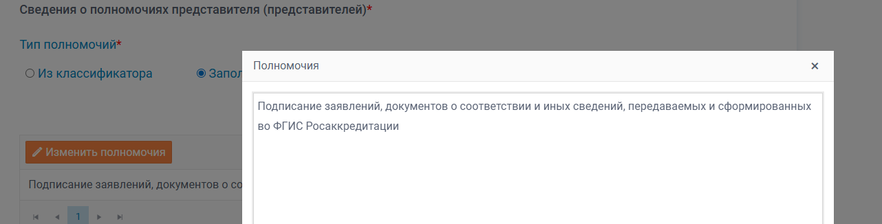 При ручном указании необходимо внести следующий текст: "Подписание заявлений, документов о соответствии и иных сведений, передаваемых и сформированных во ФГИС Росаккредитации"
